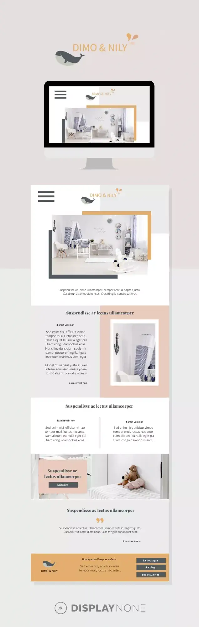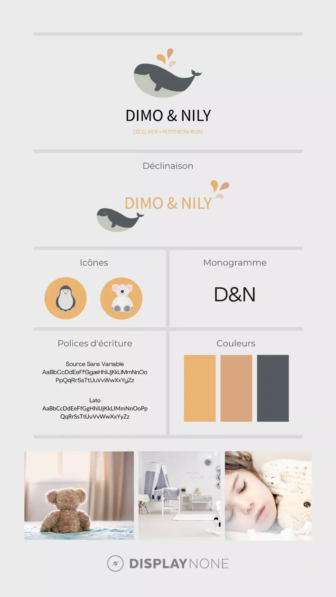 Dimo & Nily est une marque de décoration pour chambre d’enfants. Lors de notre collaboration et de la construction de l’univers graphique, nos choix se sont indéniablement tournés vers le monde de la petite enfance. Cela se reflète notamment grâce aux touches de couleurs pastels et l’illustration stylisée à l’image d’une petite baleine.